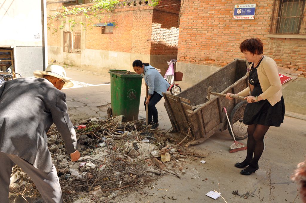 七一社区工作人员和庭院楼院长动手清运垃圾。记者 贾同岭 摄