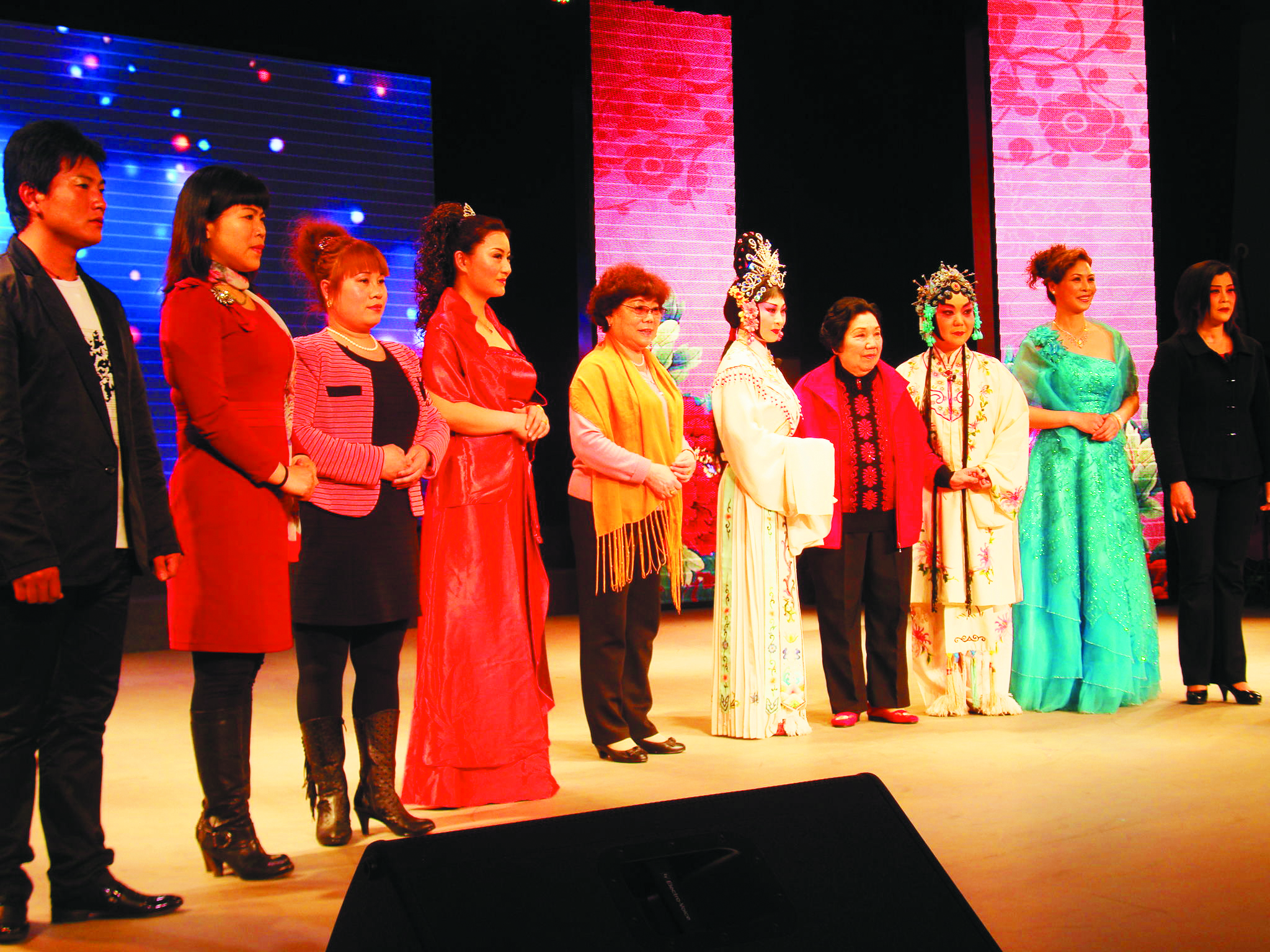 2013年4月,中国越调专场演出现场,毛爱莲(右四)和弟子、戏迷们在一起。