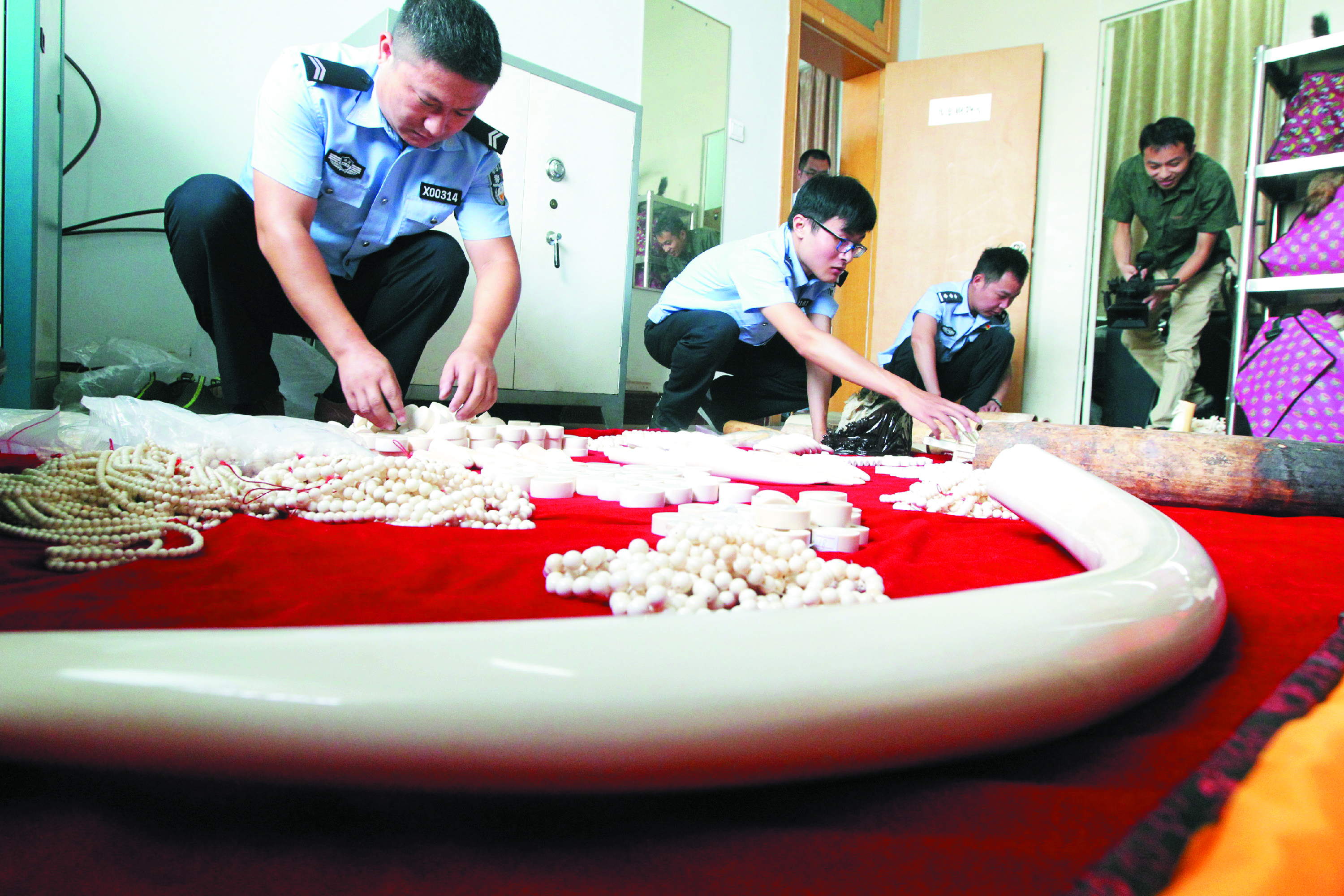 12月27日17时,民警一举将犯罪嫌疑人张某、刘某抓获。经统计,从犯罪嫌疑人张某房间内搜查出的象牙制品共计1513件。经鉴定,这些物品重26.258公斤,价值109万元,全部属于珍贵濒危野生动物制品。