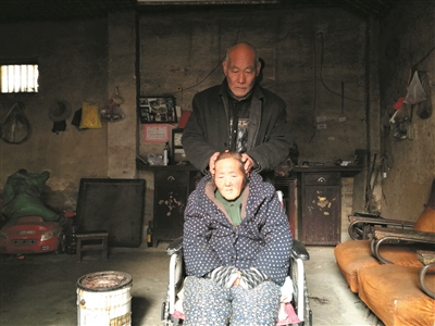 李元才给妻子俎翠月梳理头发。记者 李嘉 摄