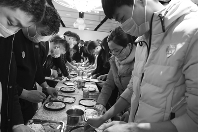 亲手做比萨,对不少人来说还是第一次。两组男女洗手后戴上口罩,在老师的指导下大显身手——男生制作火腿比萨,女生制作水果比萨。如何揉面、面饼需要多厚、如何撒配料,张研博教得认真,大家学得也认真。