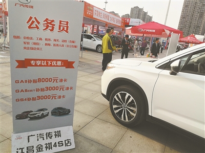 中国品牌汽车正进入越来越多的城市家庭。图为在“正通汽贸杯”第14届莲城汽车文化节上,广汽传祺推出针对公务员的促销政策。
