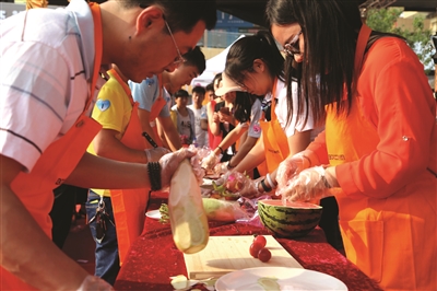 在 “厨神大比拼”环节,男女嘉宾佩戴口罩、手套等,在规定时间内完成一份“水果蔬菜沙拉”的制作。第一组嘉宾中的男士刀工很好,将西瓜皮雕出精美的造型,引得大家一阵惊呼。第二组和第三组嘉宾在盘子里分别摆出了“520”和“爱”的造型,呼应了活动主题,赢得了养生锅和电热水壶。