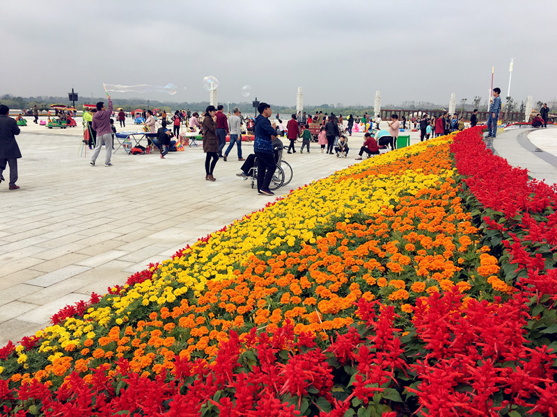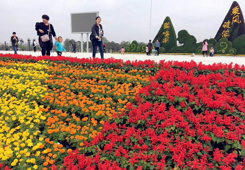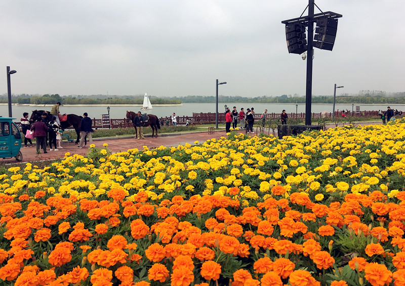 国庆期间鄢陵县鹤鸣湖景区装饰一新,各色鲜花盛开,喜气洋洋。