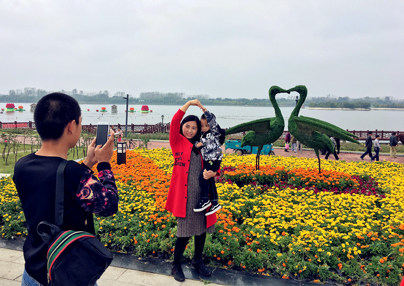 国庆期间,鄢陵县鹤鸣湖景区装饰一新,各色鲜花盛开,喜气洋洋,吸引众多游客前往休闲游玩。