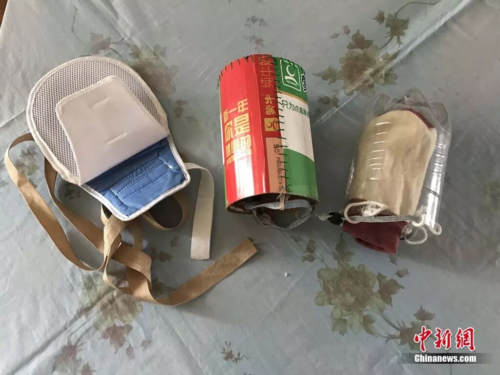 从左至右依次是网上购买、范奶奶制作、改良的约束手套