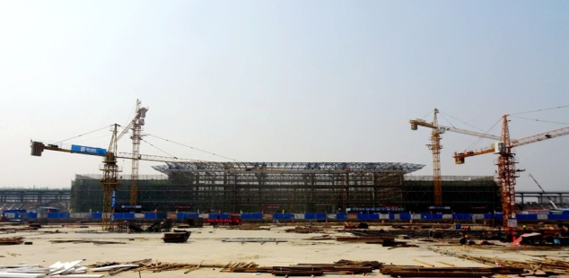 鄢陵南站站房中央顶部,搭着一个网状的钢筋架子,旁边的塔吊把一捆捆钢筋吊到上面,头戴安全帽的工人在上面作业。银白色的钢筋,在阳光下熠熠生辉。“那个网状的钢筋架子是鄢陵南站候车大厅的钢结构屋顶。”龚鹏说,鄢陵南站候车大厅的钢结构屋顶,面积达5366平方米,现已完成90%。