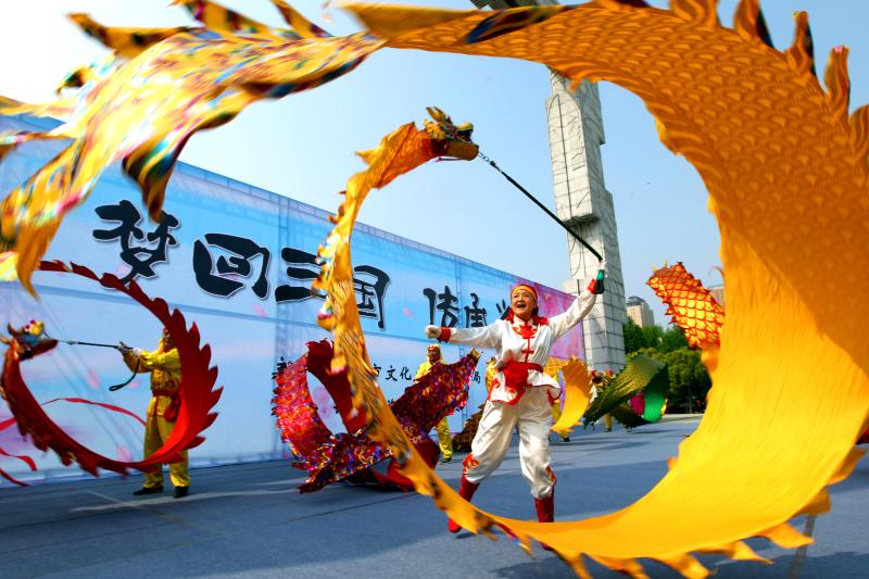 4月13日,曹魏古城舞龙艺术队的队员在许都公园表演舞龙。