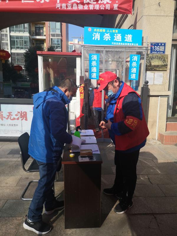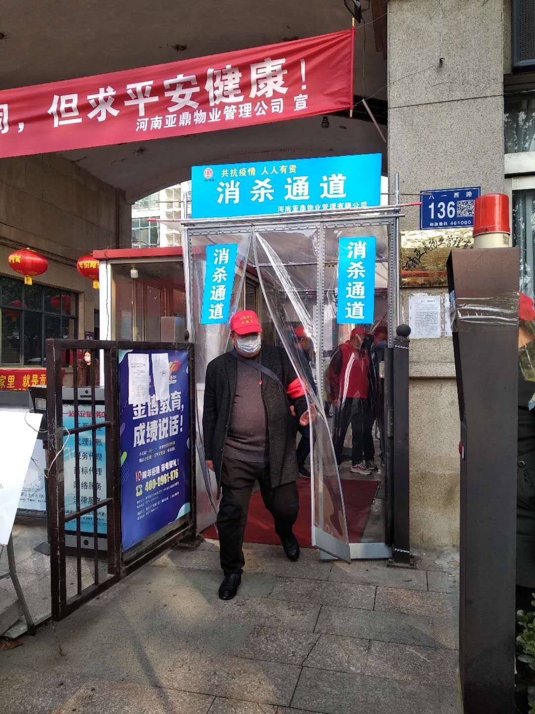在防控工作中,河南亚鼎物业发现,业主外出购买生活必需品至返回小区这个时间段有接触病毒的风险。为最大限度降低风险,他们想出在小区唯一的出入口搭建消杀通道,业主出入除了测量体温外,还要接受消毒。