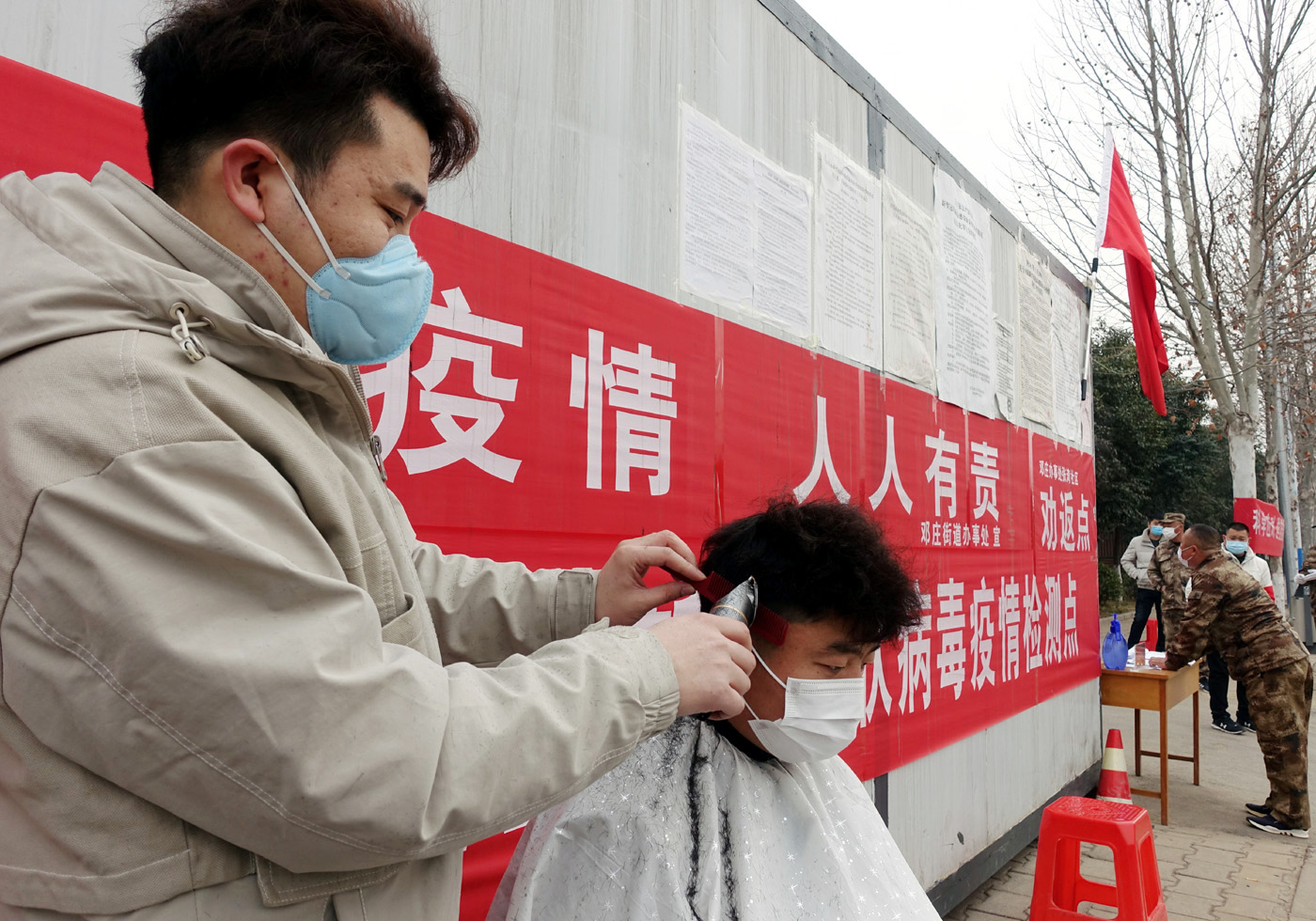 2月21日,东城区邓庄街道办事处张湾社区疫情防控检测点,一位理发师为疫情防控检测点的工作人员理发。市区星河美业美发店的理发师何文举经社区干部同意,携带理发工具,经过消毒,义务为疫情防控检测点的10余名工作人员理发,受到大家的欢迎。