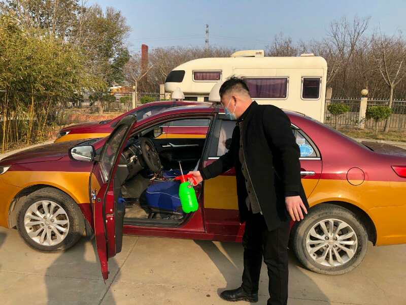 出租车司机为出租车消毒。
