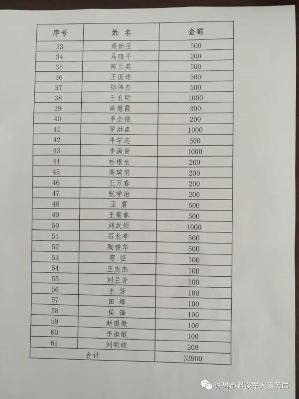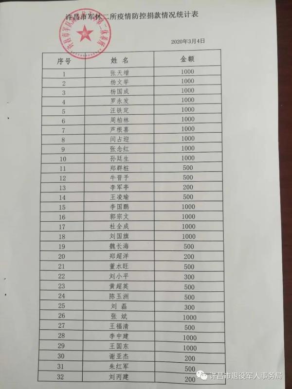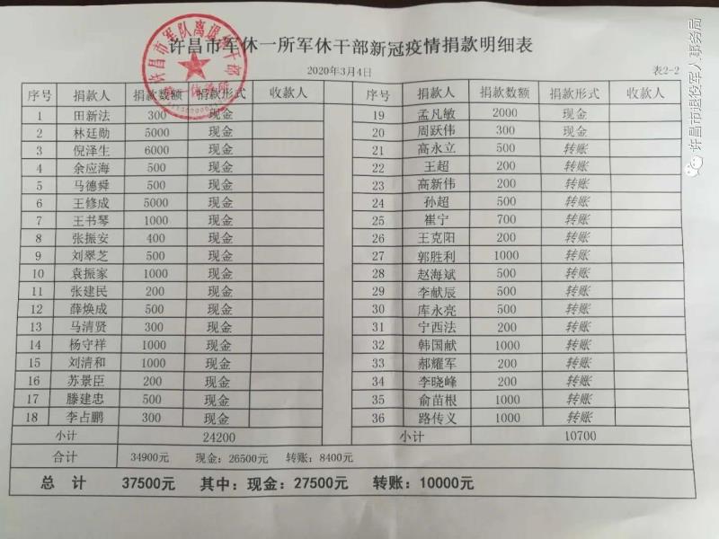 医疗人员驰援湖北、各类物资捐赠武汉……发生在祖国大地上的新冠肺炎疫情牵动着所有中国人的心,也牵动着许昌市全体军休干部的心。为响应党中央号召,许昌市军休系统面对系统内全体离退休干部、退休士官和工作人员发出了《“病毒无情 军休有爱”疫情防控捐款倡议书》。倡议书发出后,得到全体军休干部和工作人员的热烈响应,大家立即行动,踊跃捐款,并表示将以此次捐款活动为契机,永怀爱党爱国的初心,永葆赤诚报国的军人本色,用实际行动助力国家抗击疫情。截至3月4日,许昌市军休一所、军休二所的全体离退休干部、退休士官、工作人员分别为疫情防控工作捐款37500元、33900元。