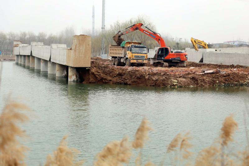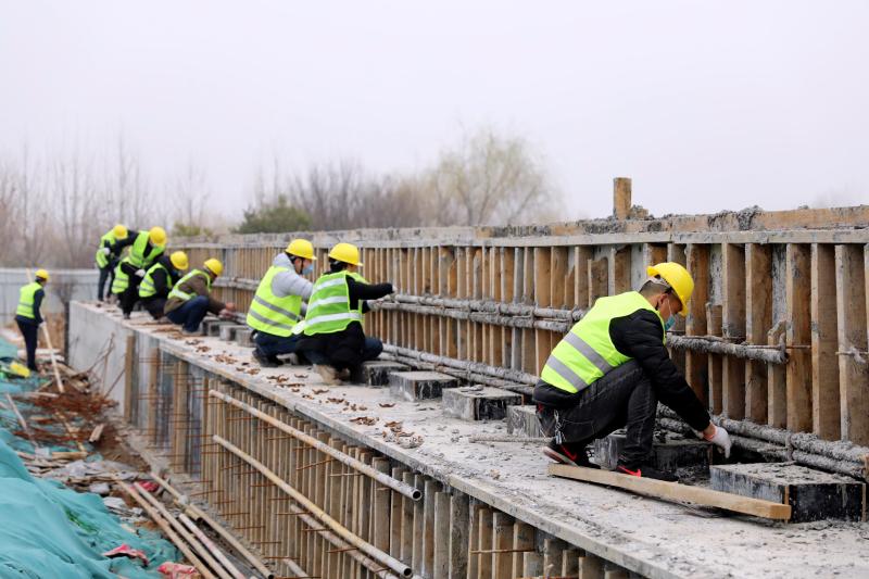 3月11日,建安区魏文路北海桥建设项目工地上,工人正在加紧项目施工。该项目建设跨南水北调管线桥梁、北海桥及连接路工程,完工后将为周边居民提供更加便利的出行条件。