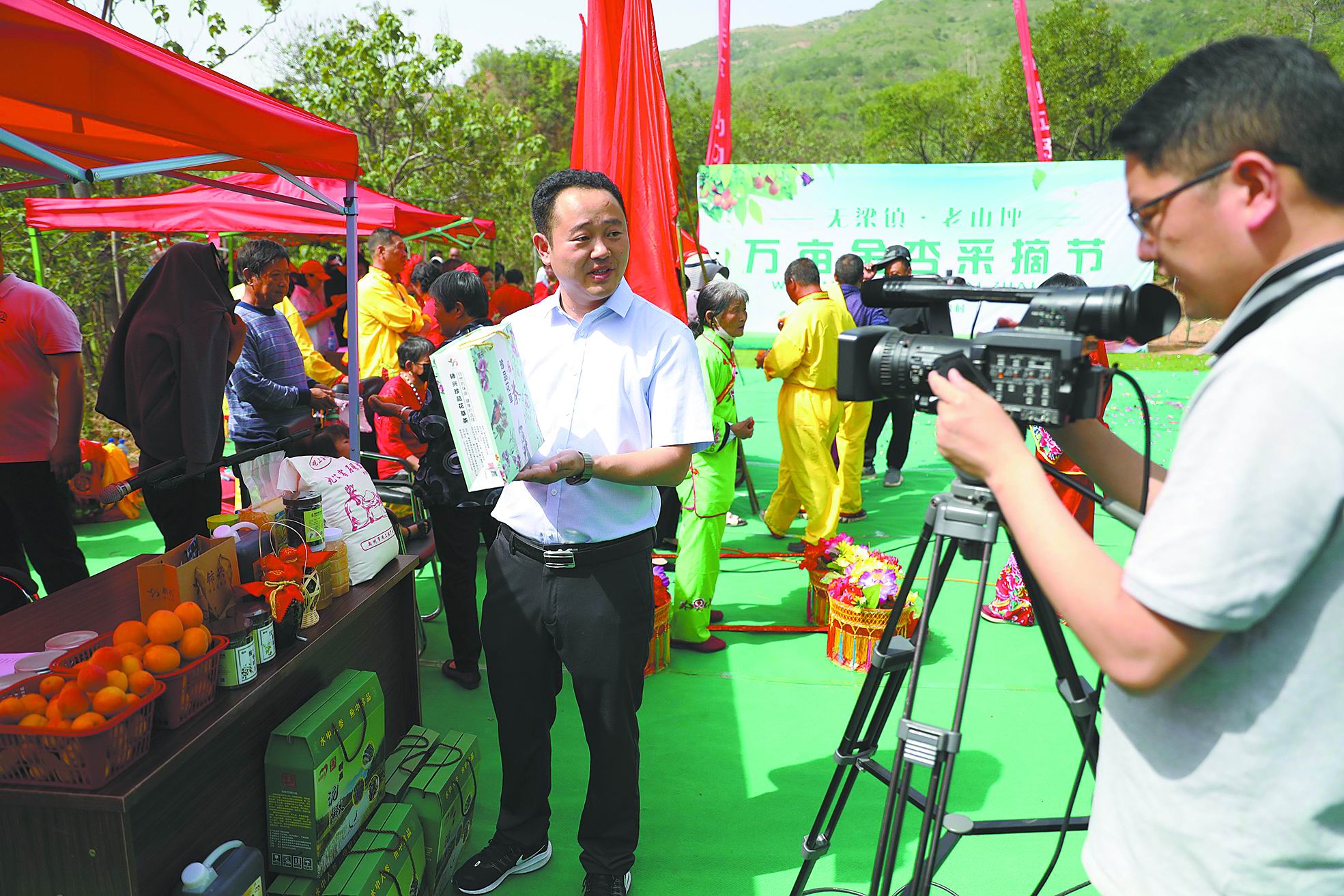 5月17日,在禹州市无梁镇王家村的 “万亩金杏”采摘节上,该镇镇长王虎通过网络直播推介各类农产品。当天,许昌报业传媒集团下全媒体平台、许昌城市电视全程直播推介无梁镇的王家杏、石碾小米、刘家寨蜂蜜、花草茶等特色优质农产品,助力乡村振兴。 本报记者 乔利峰 摄