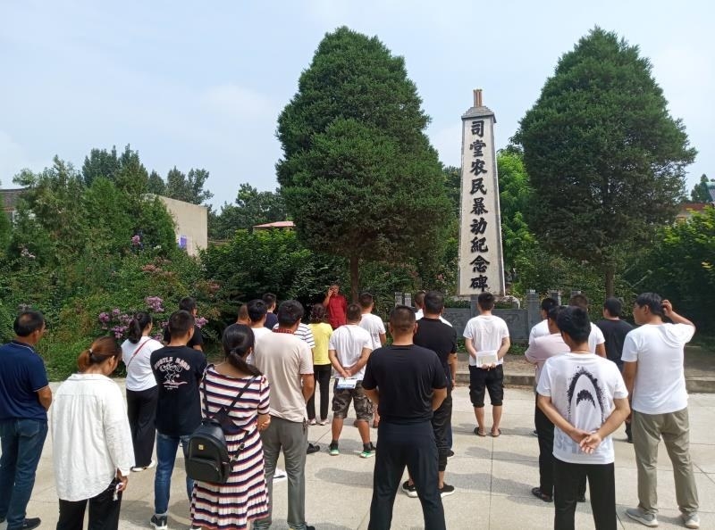 7月29日,建安区苏桥镇党校组织党员发展对象到司堂农民暴动纪念碑下上党课,进行现场教学。司堂社区67岁老党员杨景尧为大家讲述1928年司堂2000多名农民在中共许昌县委组织下打土豪、分田地的革命历史。 记者 黄舒平 摄
