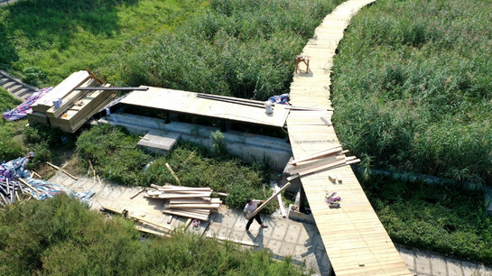 这是8月23日拍摄的清潩河(前进路—许由路)人工湿地栈道项目的施工现场。据悉,清潩河(前进路—许由路)人工湿地栈道项目全长1.6公里,其中木栈道长1385米,有8个平台、9个楼梯;预计8月底完工。该项目完工后,东城区水务局将对其进行亮化,打造出一道亮丽的风景线。 记者 牛书培 摄