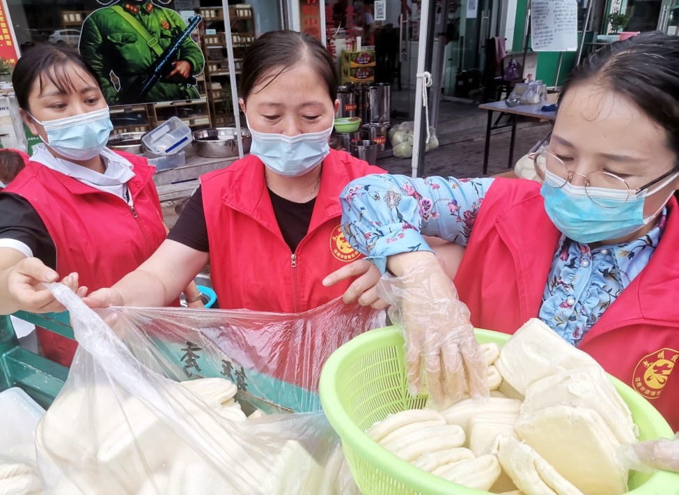8月15日,许昌市文峰社区爱心粥屋的几名志愿者正在为一线防疫人员准备荷叶饼等餐食。