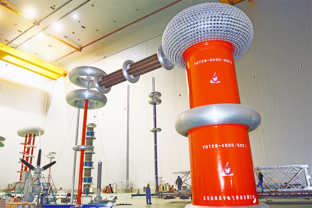 技术人员在河南省高压电器研究所有限公司特高压绝缘试验大厅内安装测试设备。