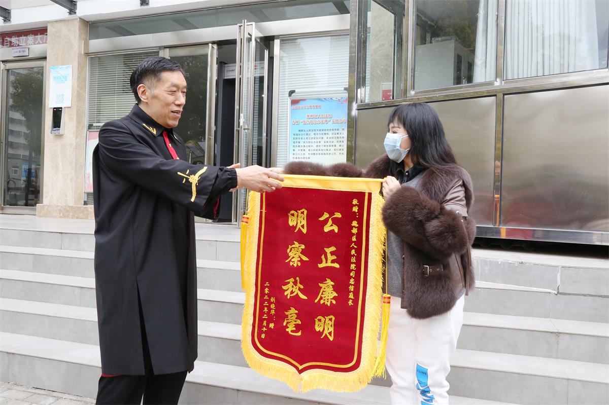 “司法官大公无私,这面锦旗当之无愧!”2月11日下午,在魏都区人民法院半截河人民法庭门口,刘女士把一面上书“公正廉明 明察秋毫”8个大字的锦旗郑重递到该法庭庭长司忠信手中。