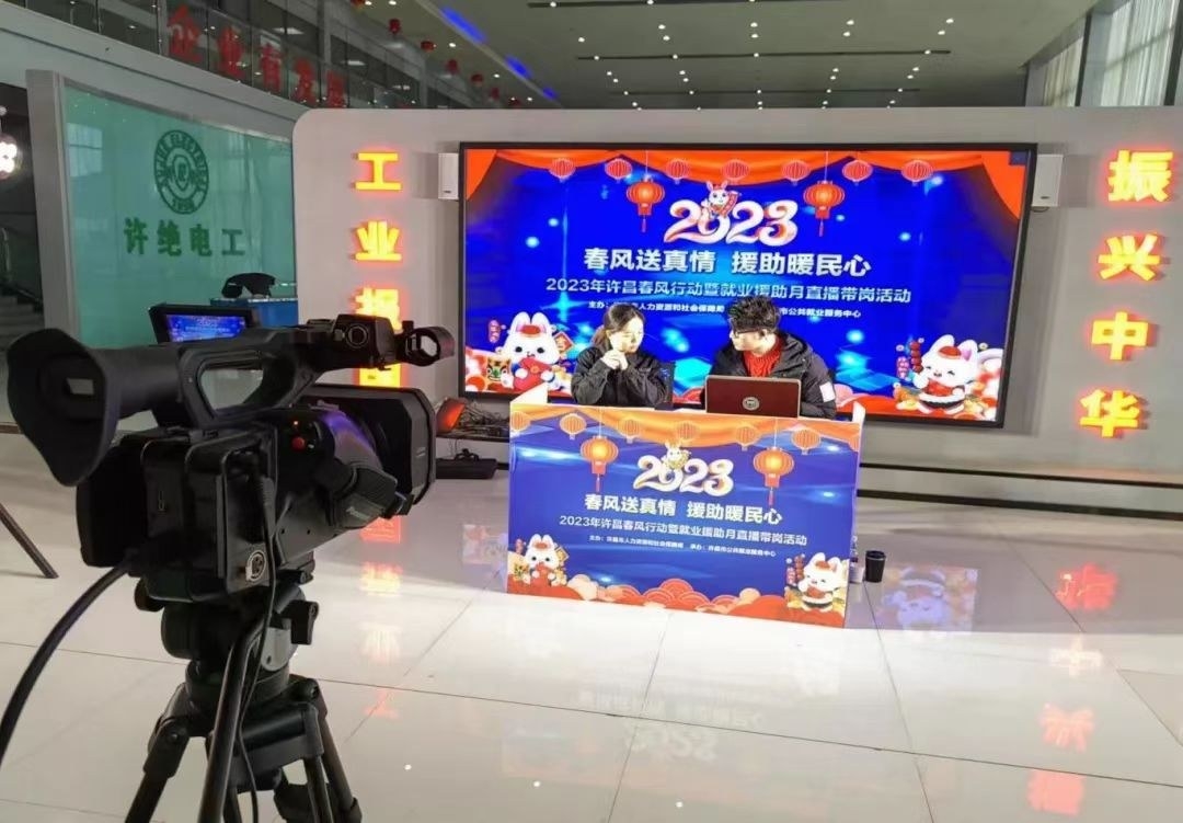 上、下图:2月9日,2023年春风行动暨就业援助月“春风送真情,援助暖民心”直播带岗活动将直播间“搬”进许绝电工股份有限公司。师瑞瑶 摄