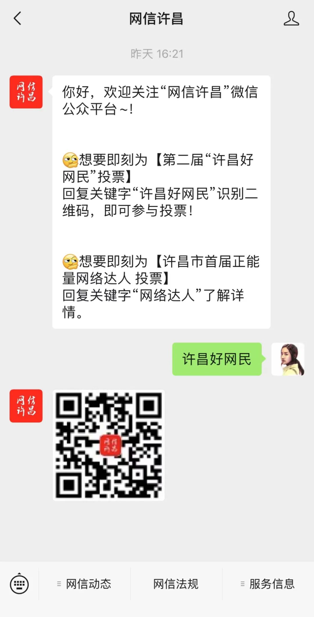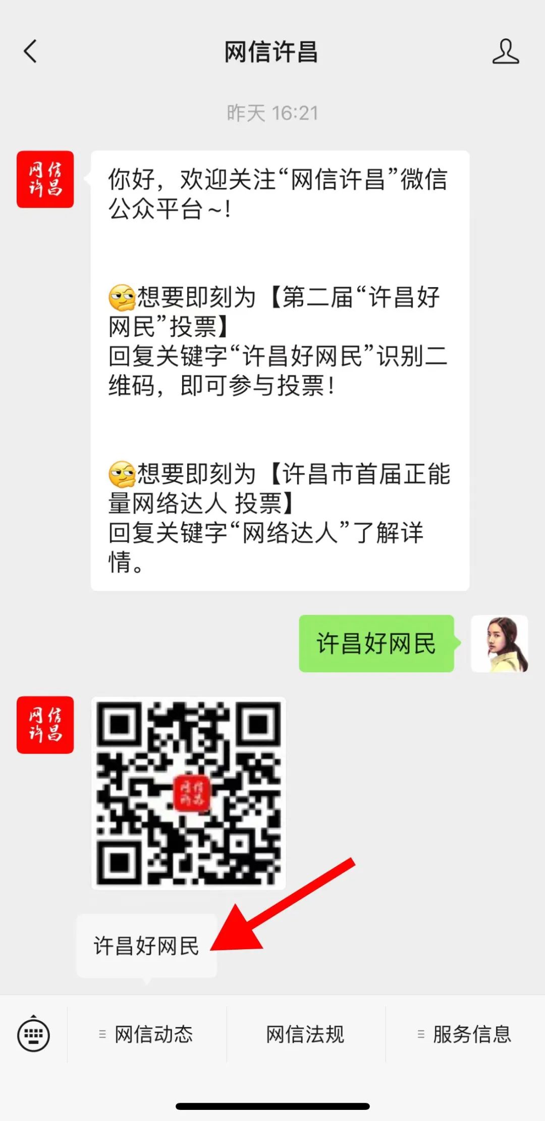 关注“网信许昌”微信公众号,回复关键字“许昌好网民”即可获得投票二维码,识别进入投票页面;