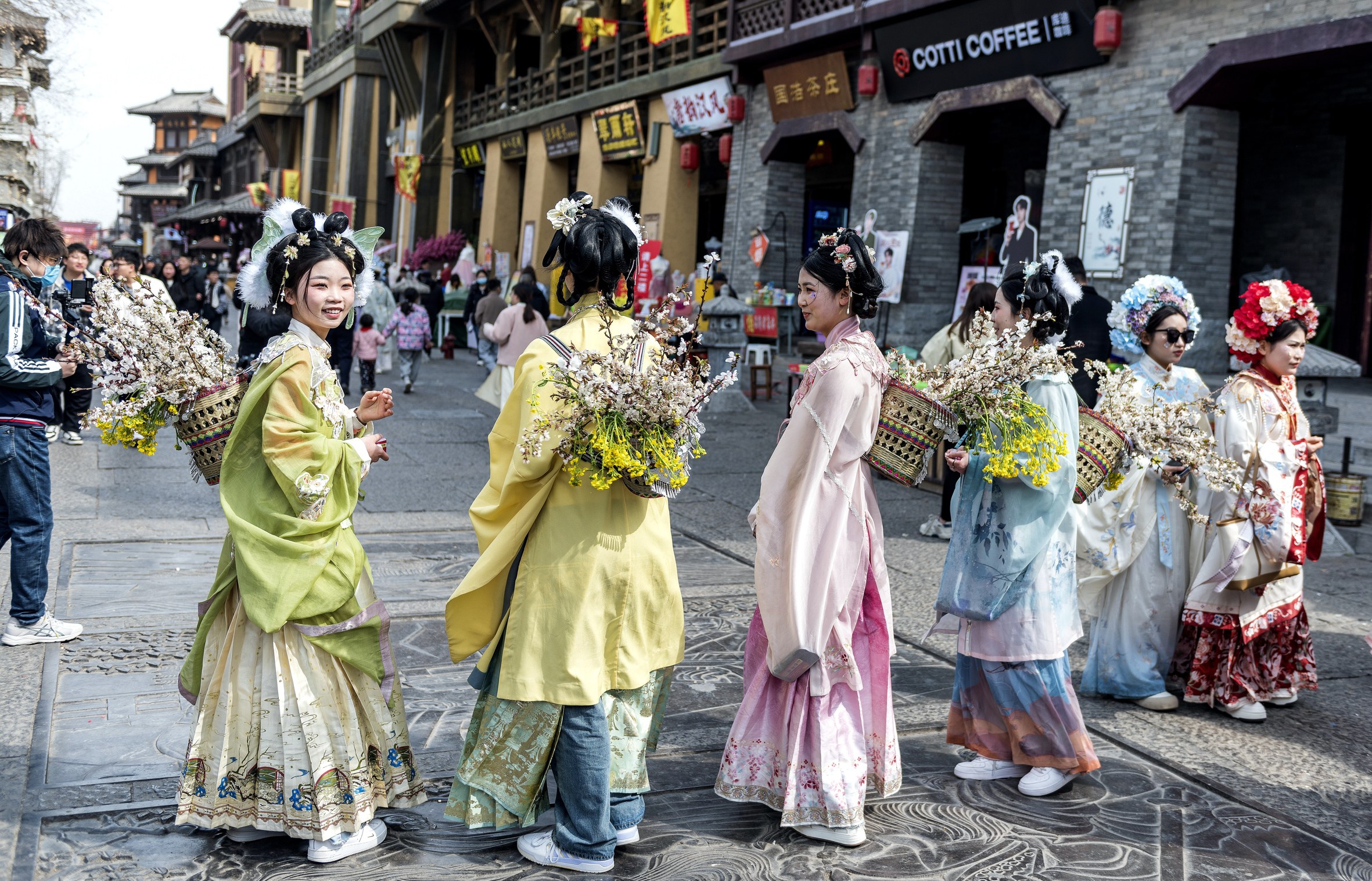 “绿杨烟外晓寒轻,红杏枝头春意闹。”3月春风暖,正值杏花盛开的时节。3月16日10时许,曹魏古城杜康楼前,5名身着汉服的“花仙子”背着装满杏花的小花篓,为游客送上芬芳馥郁的杏花。