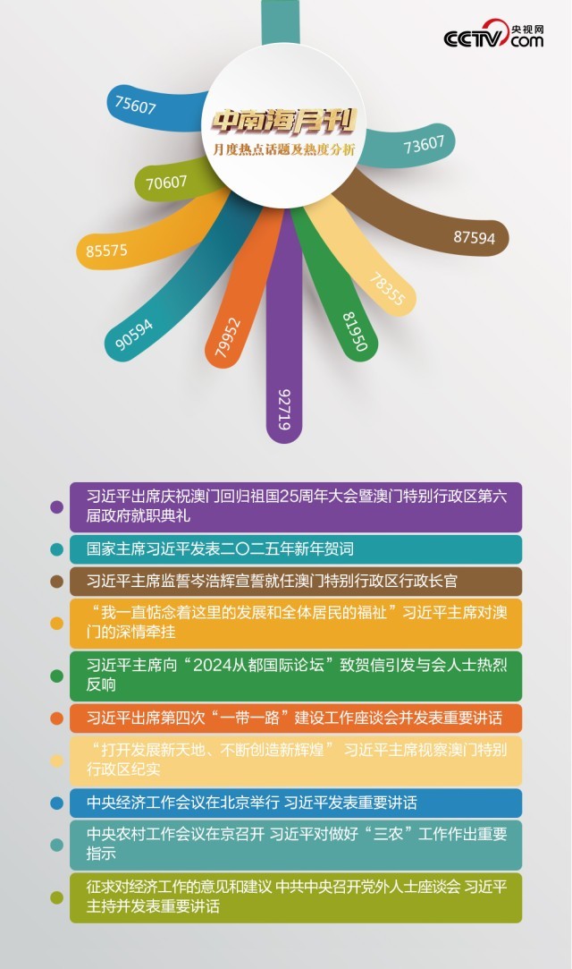 南海风起,百舸争流。盛世莲花,灼灼生华。央视网“智闻”系统提取分析2024年12月全网时政新闻热点,习近平主席澳门之行吸引全网关注。
