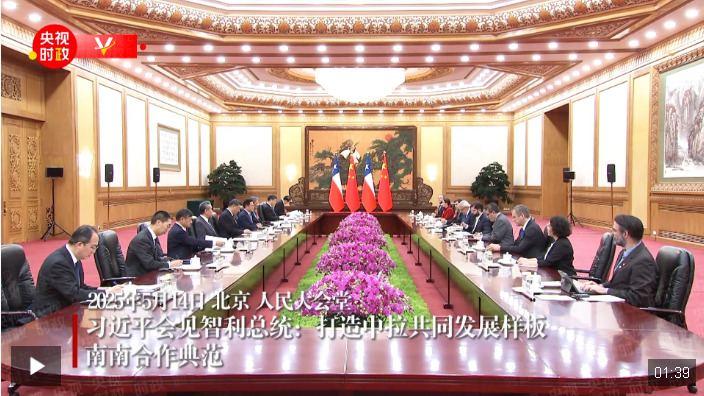 5月14日上午,国家主席习近平在北京人民大会堂会见来华出席中拉论坛第四届部长级会议的智利总统博里奇。