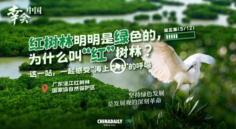 这里是全国最大的红树林保护区,全国每四棵红树林就有一棵在广东湛江。在全球红树林普遍萎缩的背景下,广东湛江红树林却实现了逆势增长,打造出了中国的“海上绿色长城”,实现红树林修复与绿色经济共赢。广东湛江的红树林保护,在习近平生态文明思想的引导下,成为了“坚持绿色发展是发展观的深刻革命”的生动注脚。