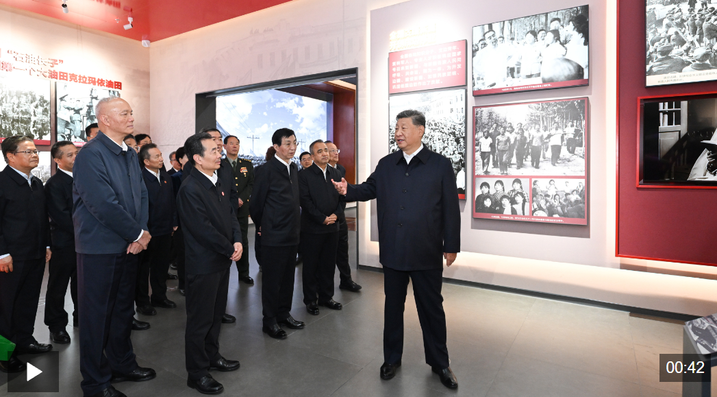 24日上午,习近平总书记在乌鲁木齐文化中心展览馆参观新疆维吾尔自治区成立70周年主题成就展。该展览全景展现了70年来在中国共产党坚强领导下、在全国各地大力支援下,新疆各族人民团结一心、艰苦奋斗、顽强拼搏取得的辉煌成就。
