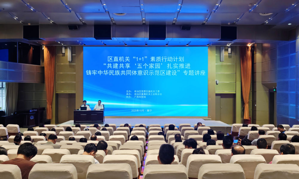 近日,自治区党委区直机关工委在南宁举办广西区直机关“1+1”素质行动计划——“共建共享‘五个家园’ 扎实推进铸牢中华民族共同体意识示范区建设”专题讲座,区直单位工会组织负责人、统战工作负责人约200余人参加。