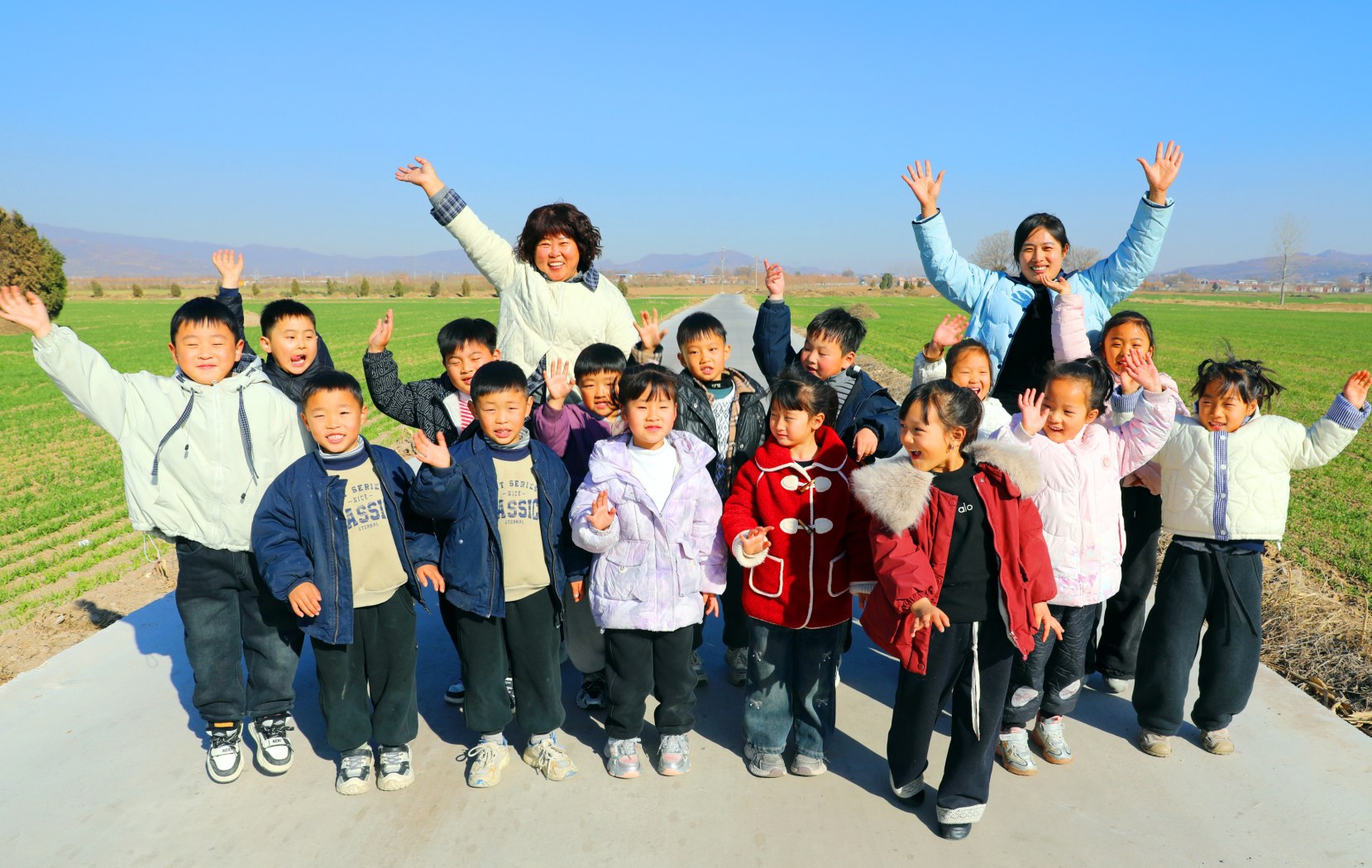 水磨河社区金贝贝幼儿园的老师带学生进行户外活动,大家走在田间小路上乐享美好时光。