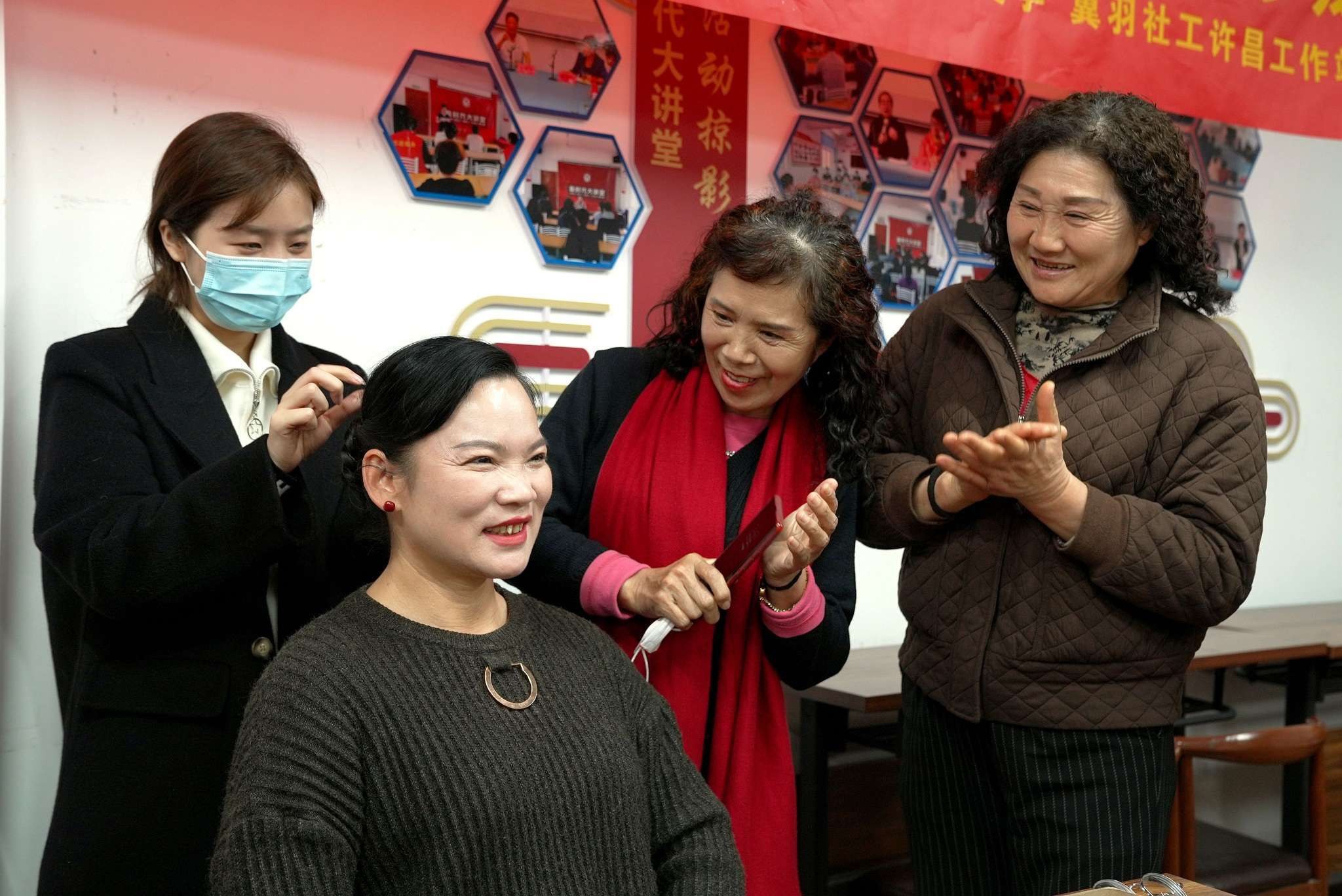 “阿姨,您平常自己涂粉底的时候,发际线部位别涂得太厚,否则妆容太假……”12月13日,魏都区文峰街道河西社区党群服务中心二楼的大厅里,专业化妆师员静左手拿着粉底膏,右手举着粉擦,一边给55岁的社区居民刘艳丽涂粉底,一边讲解化妆知识。