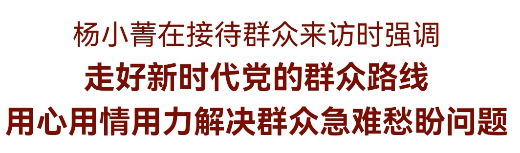 杨小菁强调,信访工作是党的群众工作的重要组成部分,各级各部门要牢固树立以人民为中心的发展思想,将心比心、换位思考,带着感情和责任做好信访工作,真正想群众之所想、急群众之所急。要聚焦群众关心关注的信访事项,深入调查研究、找准问题症结、细化解决方案,依法依规把群众反映的问题处理好、解决好,推动信访问题“案结事了”、信访群众“事心双解”。要坚持和发展新时代“枫桥经验”,推动信访工作关口前移、重心下沉,立足于抓早、抓小、抓苗头,全面深入排查、强化源头治理,确保矛盾纠纷化解在基层、解决在萌芽。要深入推进党建引领基层高效能治理,深化运用“党建+网格+大数据”基层治理模式,推动各方资源力量下沉一线,统筹开展矛盾调处、扶危济困、便民服务等工作,不断提升基层治理效能。临近年末岁尾,要时刻把群众安危冷暖放在心上,扎实做好清欠农民工工资、困难群众救助、安全生产等工作,让广大群众温暖过冬、安心过节。