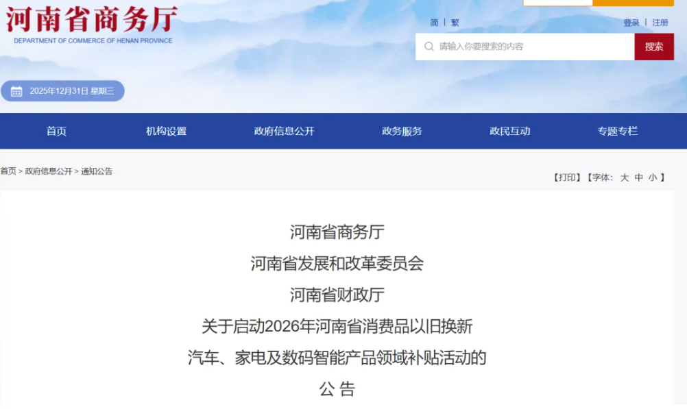 12月31日,我省就2026年河南省消费品以旧换新汽车、家电及数码智能产品领域补贴发出公告。全文如下: