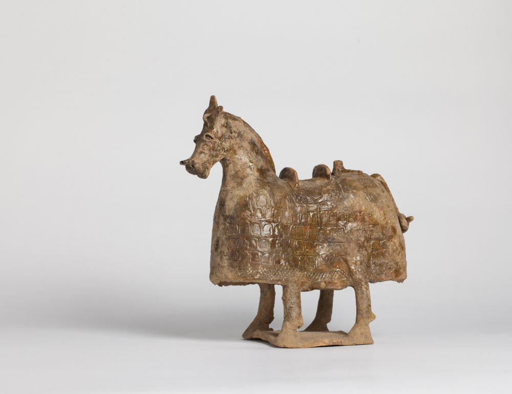 展厅深处,一尊十六国时期的褐釉马铠俑凛然伫立,它头戴络头,背配鞍具,下衬障泥,边挂马镫,披挂齐整的铠甲让人不难想见它在战场上的气势。