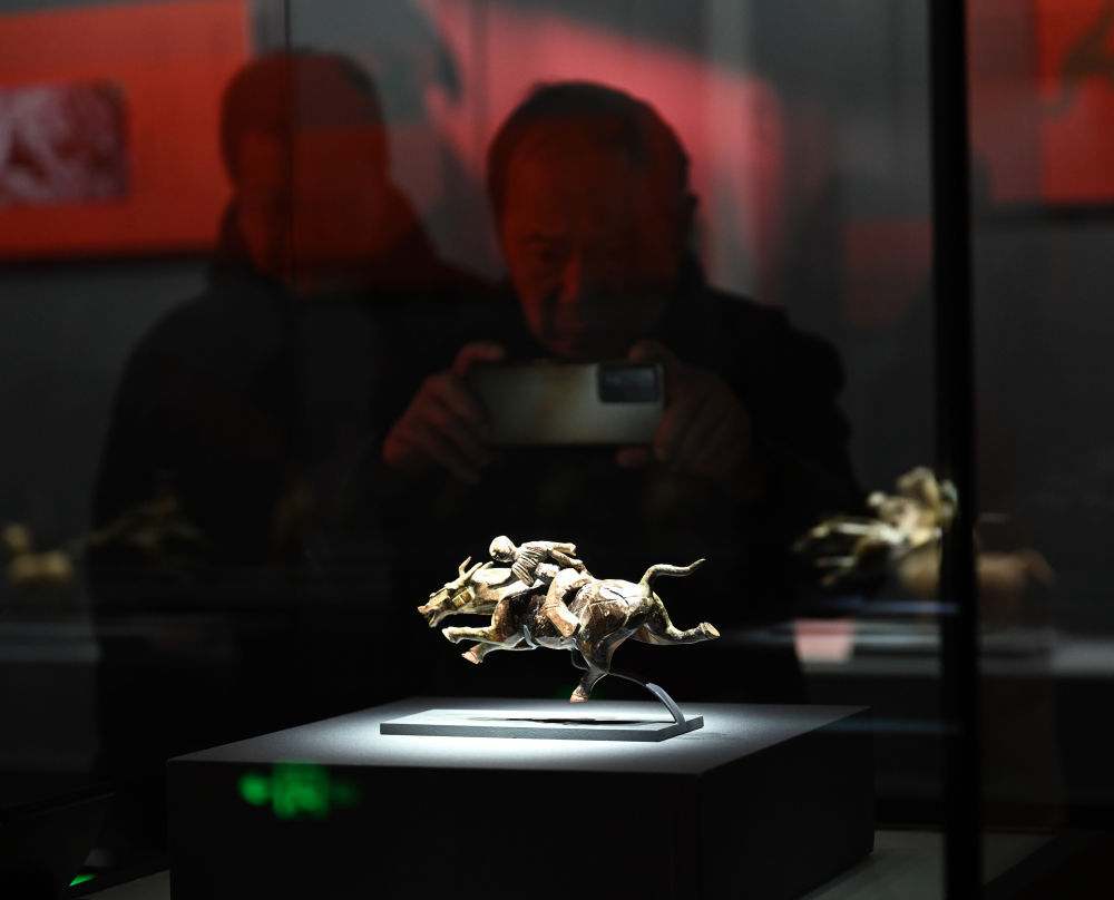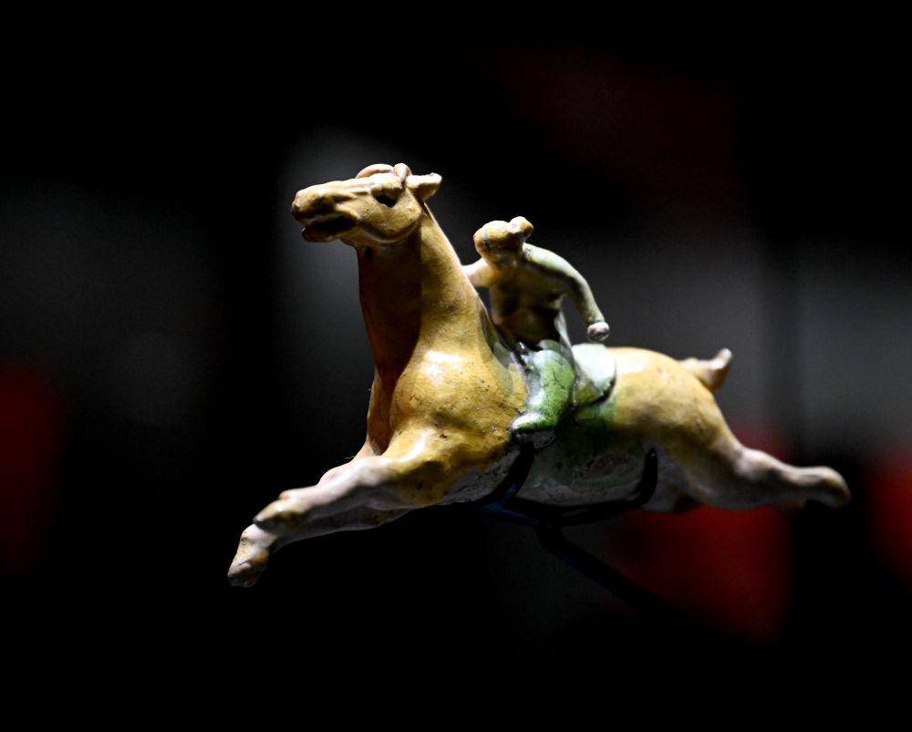展览中,多件汉、唐时期的骑马俑极富动感,其中一件汉代绿釉勇士骑飞奔马俑尤为传神,骏马三蹄腾空、作疾驰状,马背上的武士挎弓持刀,神情冷峻,仿佛正传递紧急情报。