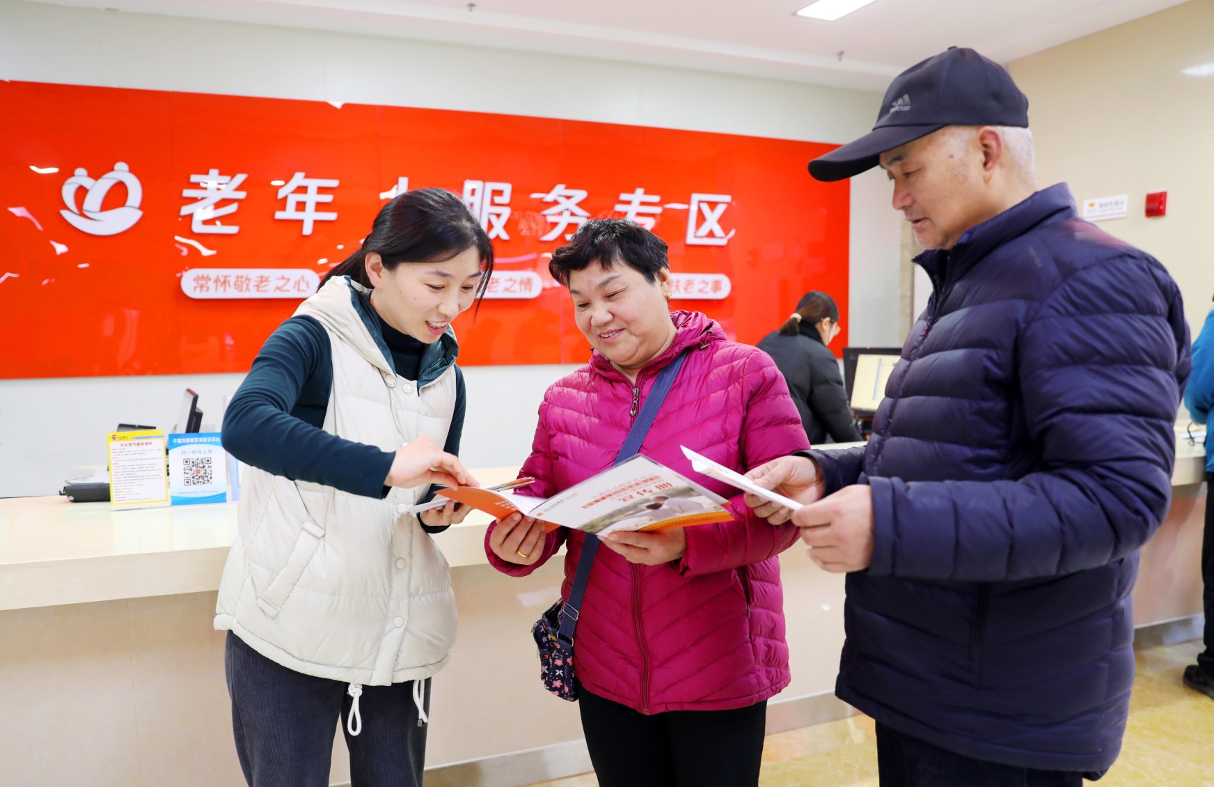 工作人员为前来办理住院护理扶助申请的老人发放宣传页,并耐心讲解相关规定。本报记者 谭宜姝 摄