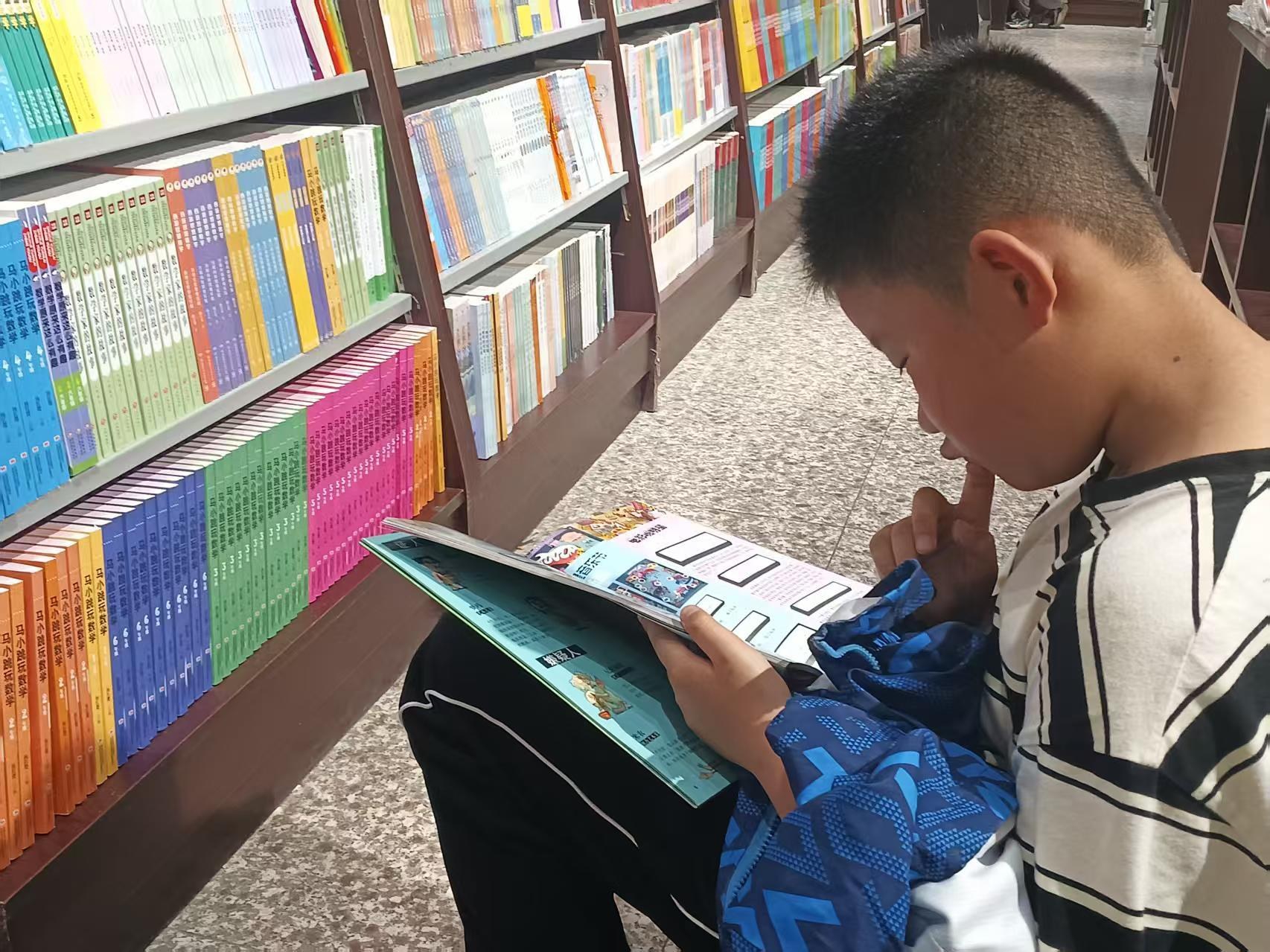 一个小男孩儿在新华书店里读书。
