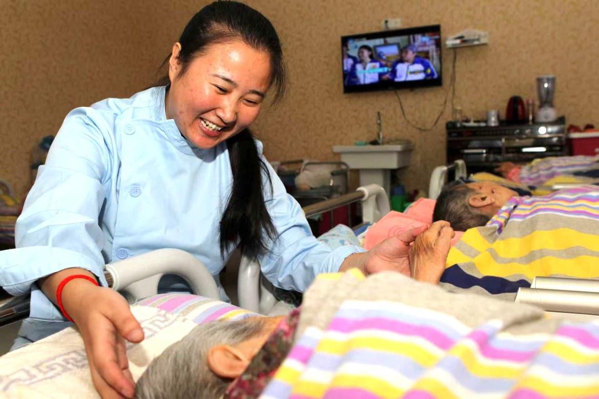 护工在照顾老人。本报记者 牛书培 摄