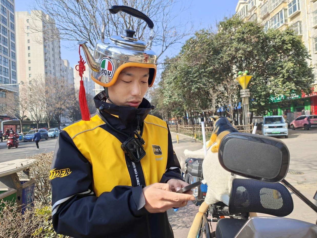 2月15日上午,春节前夕,在学府街东段一个外卖聚集点,记者见到了正准备接单的李钱深。他特意戴上那顶标志性的“水壶”头盔,穿上工装,精神抖擞准备出发。