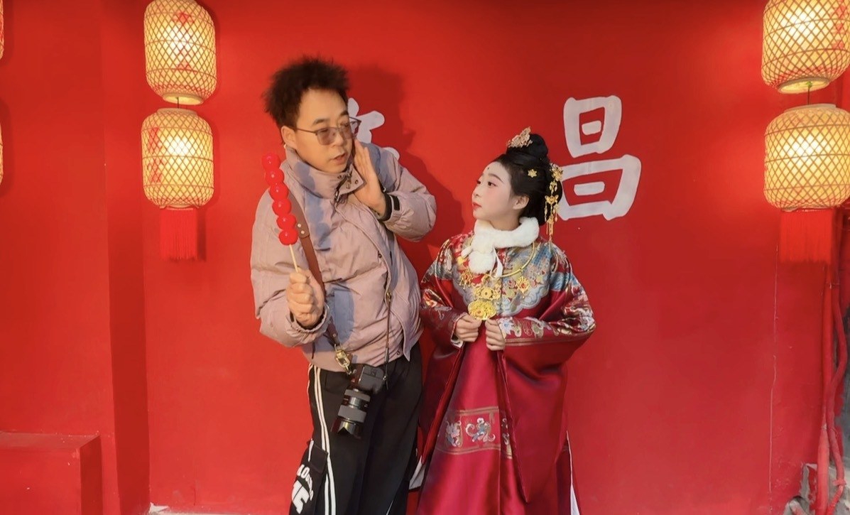 “游客做好妆造了,侯老师接单!”亭亭玉立汉服店负责人赵青打来电话催促。侯帅送别北京父女二人,拉起装满道具的小推车,匆匆赶去接拍下一拨游客。