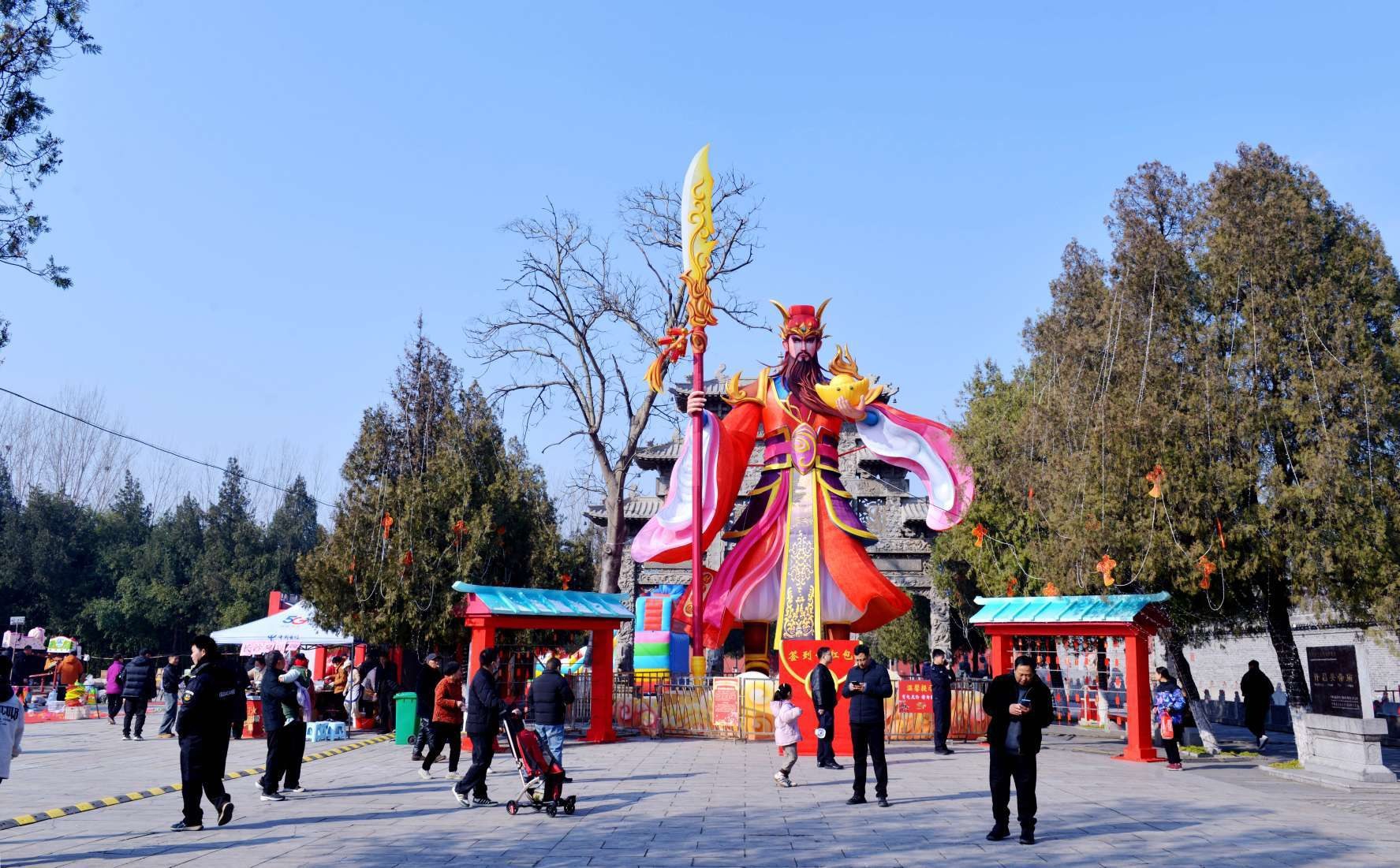 2月21日,灞陵桥景区。该景区设置的大型卡通关公像吸引了众多游客。本报记者 吕科 摄