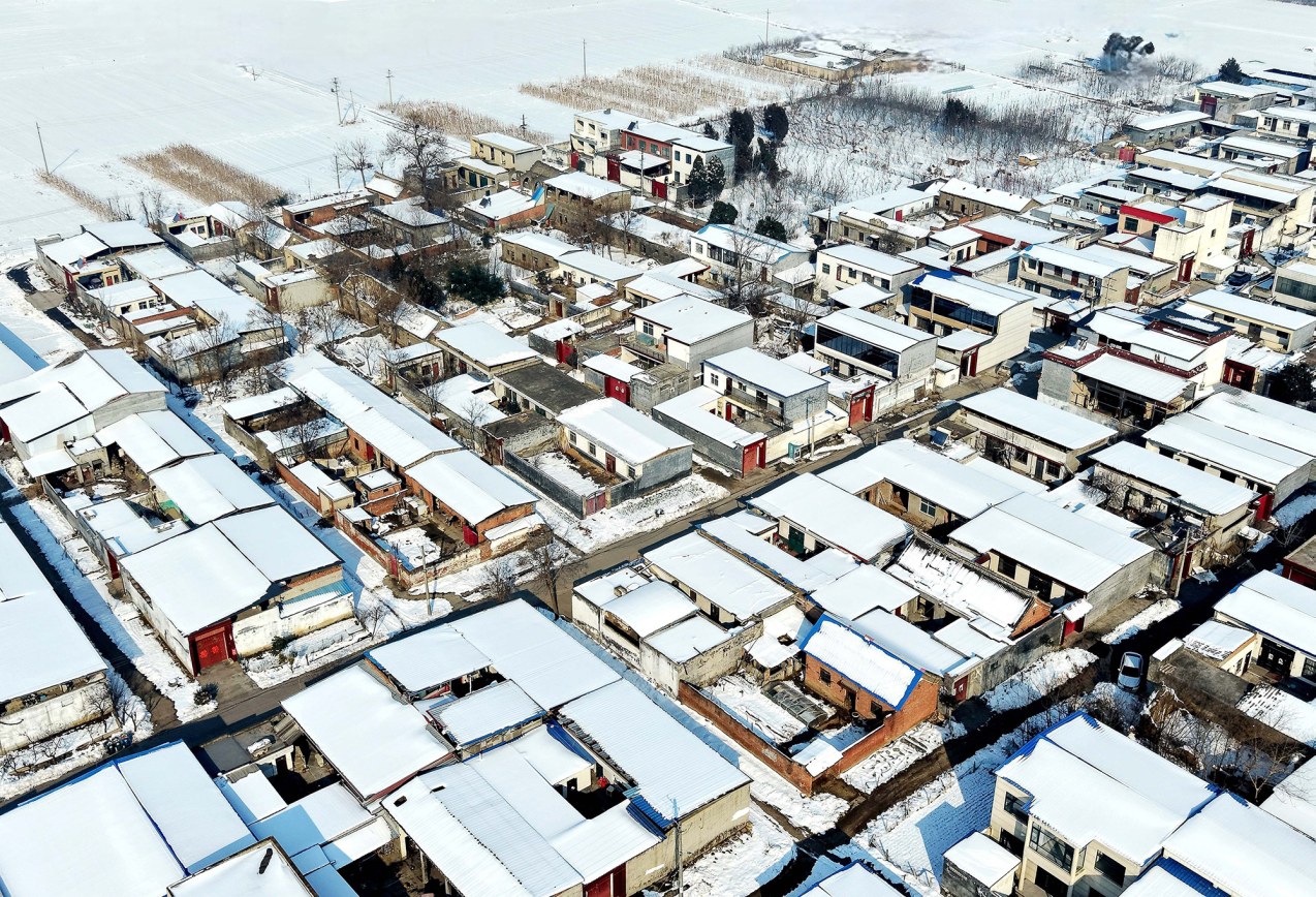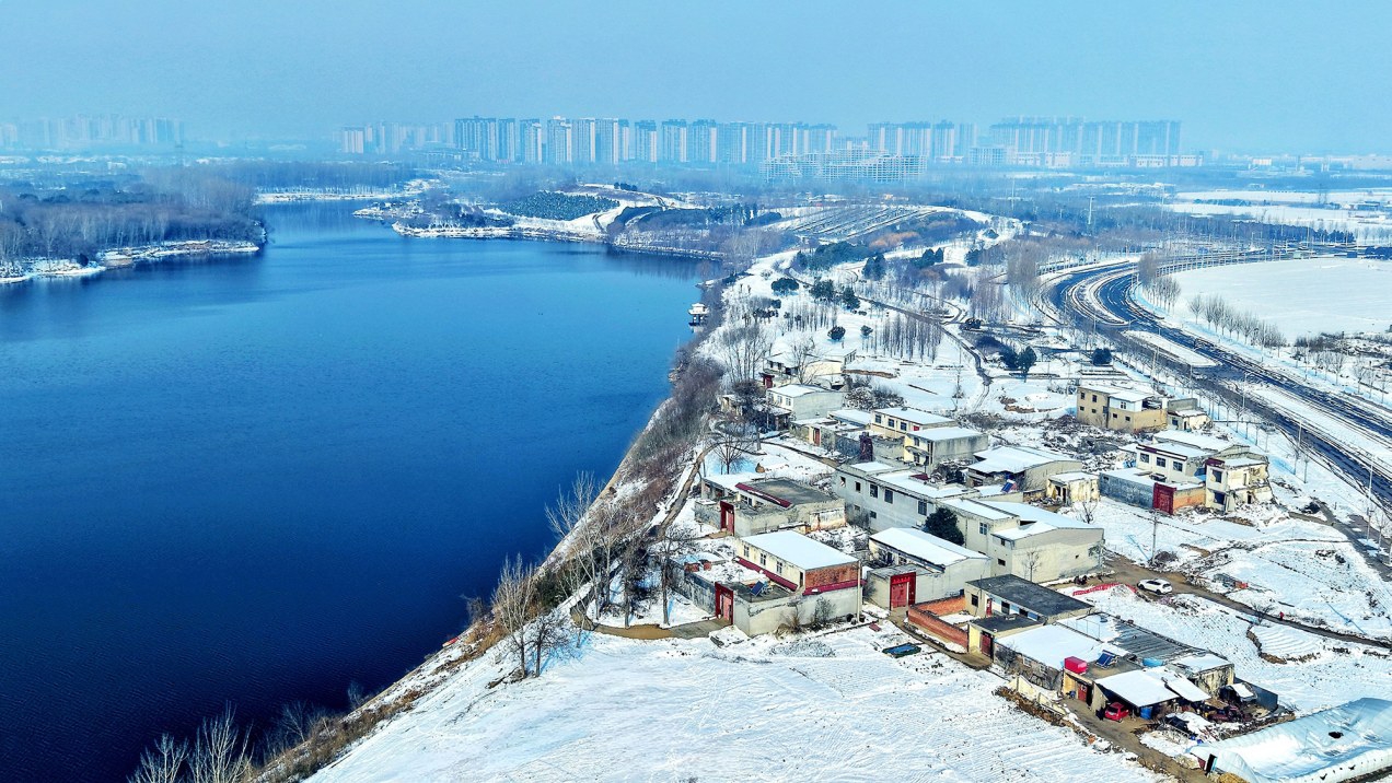 登善湖的名字取自唐高宗时封河南郡公的褚遂良字“登善”。这一命名体现了对古代名人的纪念,也寓意着湖水所展现的上善至柔之美。登善湖位于城乡接合部,占地面积达210亩,东西长900米,南北宽220米。大雪过后,湖畔小村庄隐在雪雾里,屋顶覆着厚雪,炊烟若有若无,为素净的画卷添了几分烟火气。不远处鳞次栉比的高楼,褪去了喧嚣,轮廓被雪勾勒得柔和,竟也与古朴村落、自然景致相融,成了画中恰到好处的落笔。