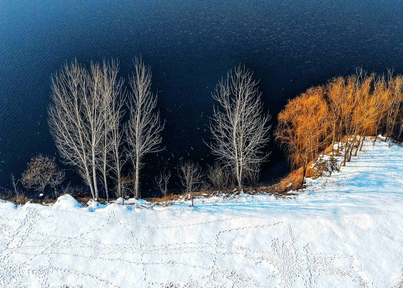 岸边的绿化树裹上银霜,墨色枝干遒劲舒展,雪粒缀满枝丫,似笔尖蘸了留白,在蓝天下晕开淡影。湖水未封,澄澈如墨玉,映着漫天清透的蓝,又将岸边雪色、树影悉数揽入怀中,一动一静间,尽是水墨交融的意趣。