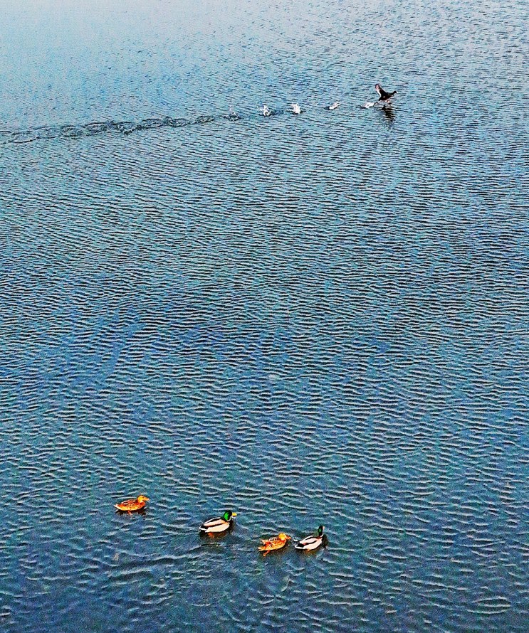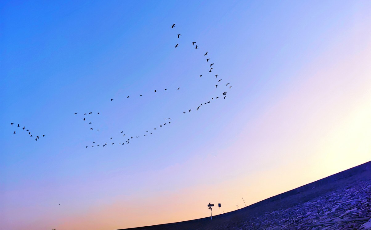 12月18日,冬日暖阳洒满禹州市朱阁镇郑湾水库,山岗间回荡着清脆的鸟鸣,奏响冬日生态欢歌。天空中,成群的大雁舒展翅膀,时而盘旋翱翔、引颈长鸣,时而轻落水面、漾起粼粼波光;清澈的湖面上,斑嘴鸭结对游弋、低头觅食,灵动的身影与湛蓝天空、金黄岸线相映成趣,勾勒出一幅和谐共生的冬日画卷。