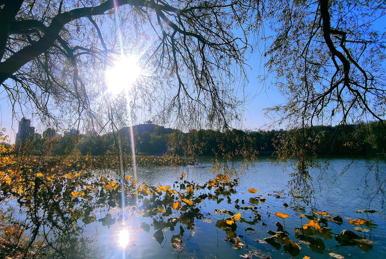 颍河湿地则多了几分清雅。残荷立在水中,枯瘦的枝丫擎着褐黄的莲蓬,承着细碎的阳光。岸边芦苇轻摇,雪白的絮毛随风曼舞,与垂落的金黄柳叶缠绵。偶有水鸟掠过,翅尖划破水面,搅碎这幅暖冬静画,留下一圈圈温柔的涟漪。
