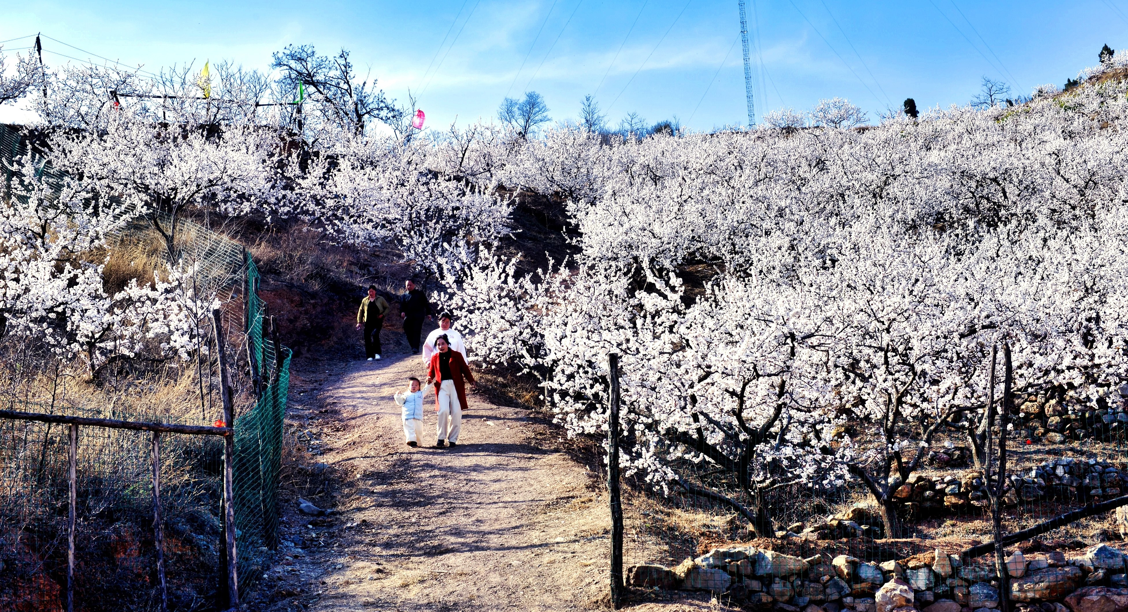 洁白的杏花迎春怒放,似雪似梦,似云似雾,密密匝匝,蔚为壮观。