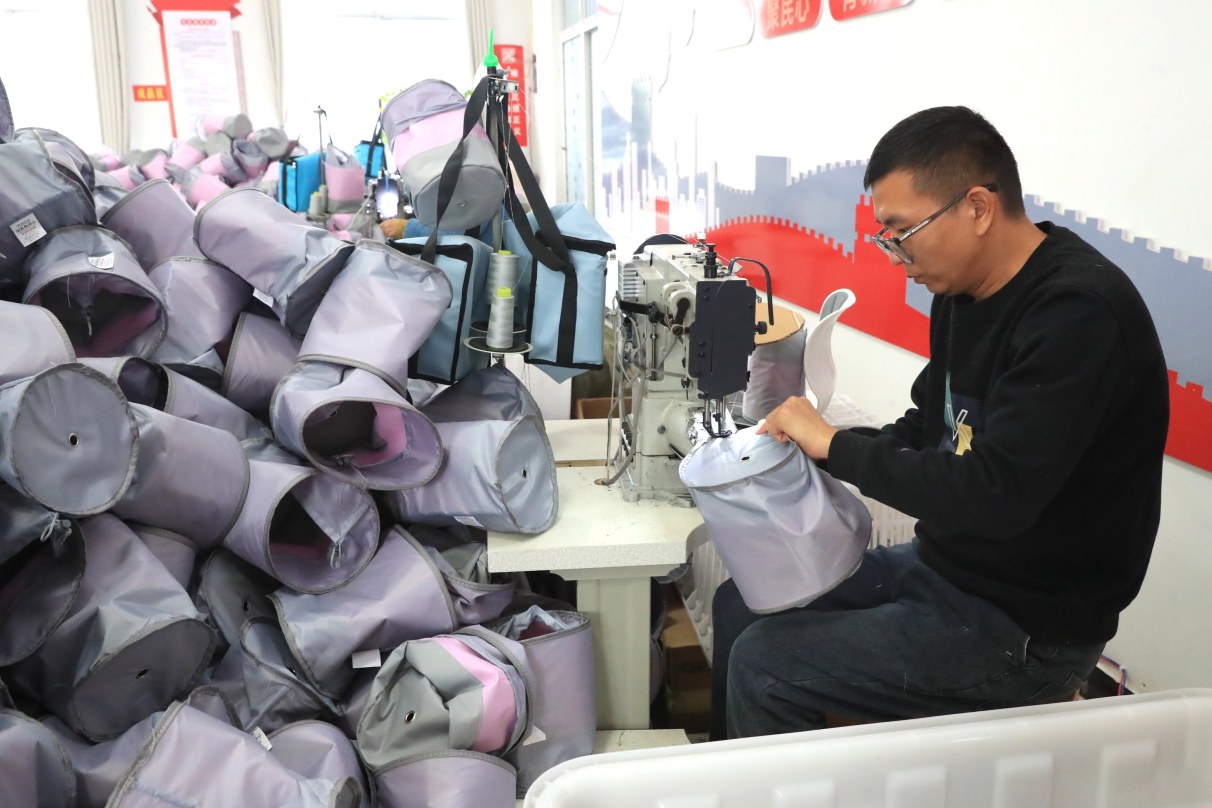 鄢陵县彭店镇的一家箱包加工企业,工人在工作。本报记者 牛书培 摄